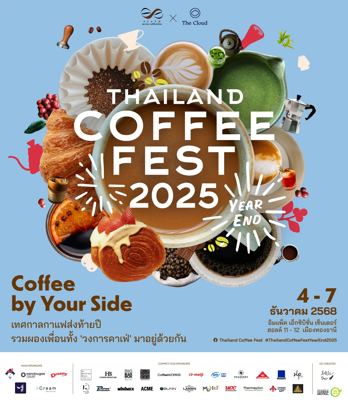 Thailand Coffee Fest ‘Year End’ 2025 เปิดบ้านต้อนรับเหล่าคนรักการดื่มอีกครั้ง ในบรรยากาศที่รวมผองเพื่อนในวงการคาเฟ่เอาไว้มากที่สุด ในปีนี้เราขยายพื้นที่ใหญ่ขึ้นรวมกว่า 13,500 ตารางเมตร คับคั่งไปด้วยร้านกาแฟและเครื่องดื่มกว่า 200 ร้าน งาน Thailand Coffee Fest ‘Year End’ 2025 จัดวันพฤหัสบดีที่ 4 ถึงวันอาทิตย์ที่ 7 ธันวาคม พ.ศ. 2568 ณ IMPACT Exhibition Center Hall 11 – 12 เวลา ตั้งแต่ 10.00 – 20.00 น. เข้างานฟรี อยู่เคียงข้างกับงาน Thailand Rice Fest 2025 เทศกาลอาหารที่รวมเรื่องราวของข้าว อาหารปลอดภัย และวัตถุดิบท้องถิ่นจากทั่วไทย